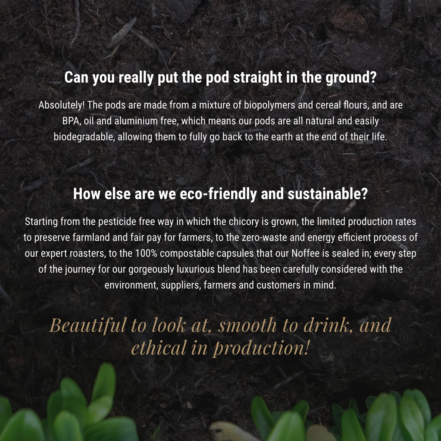 Our Nespresso compatible pods are 100% bio-based and entirely home-compostable, allowing it to fully give back to the earth at the end of its life. They are also BPA, oil and aluminium free (read more).